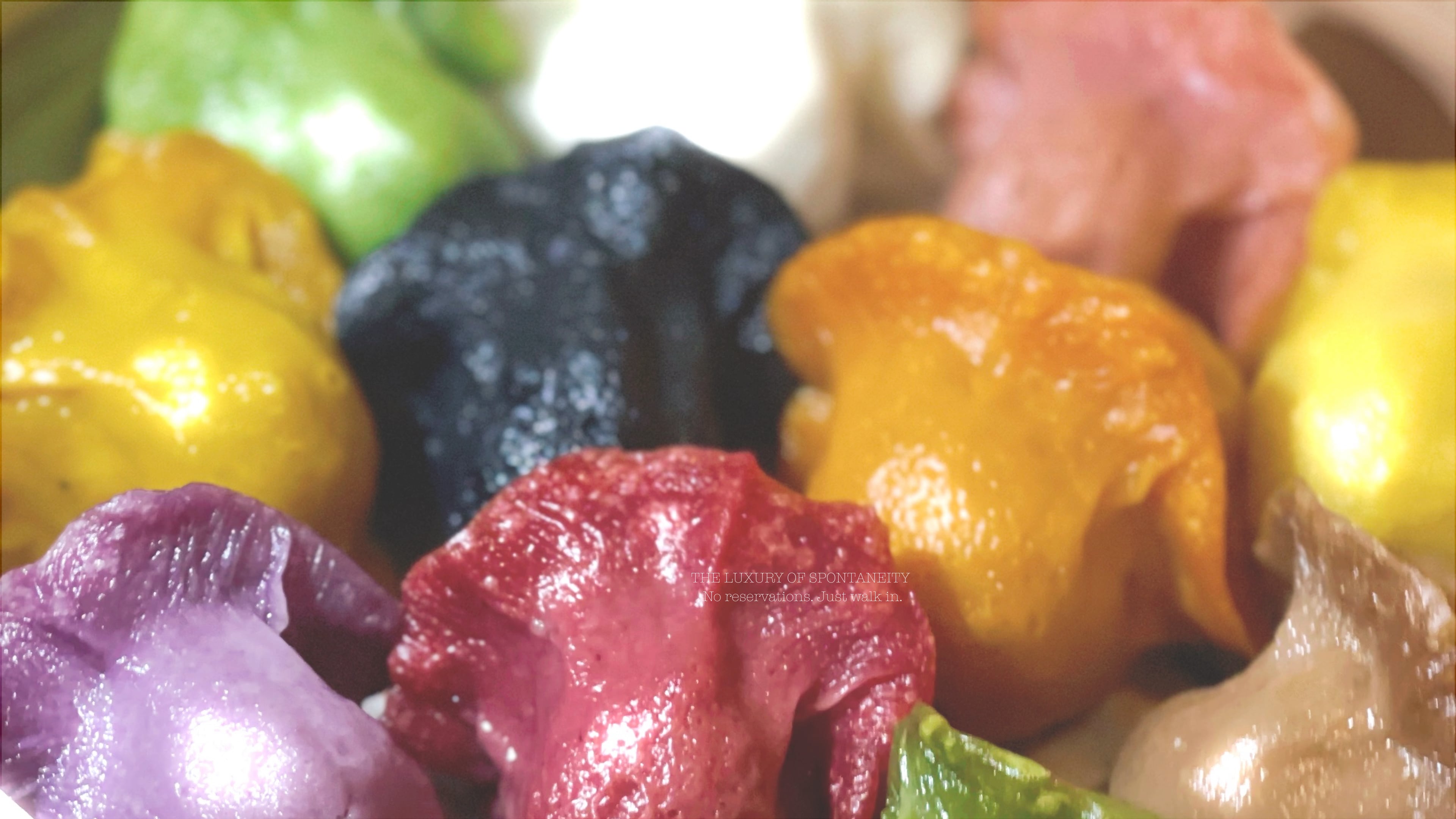 皮はすべて店内で手作りしています。小麦粉に野菜と果物を練り込んだ特製生地は、着色料を一切使わず、自然の彩りだけで仕上げています。一般的な餃子よりも厚みがあり、食べ応えがあるのが特徴です。